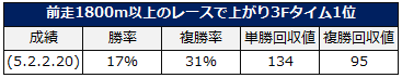 注目したいデータは前走1800m以上のレースに出走し上がり3F1位のタイムをマークしている馬。